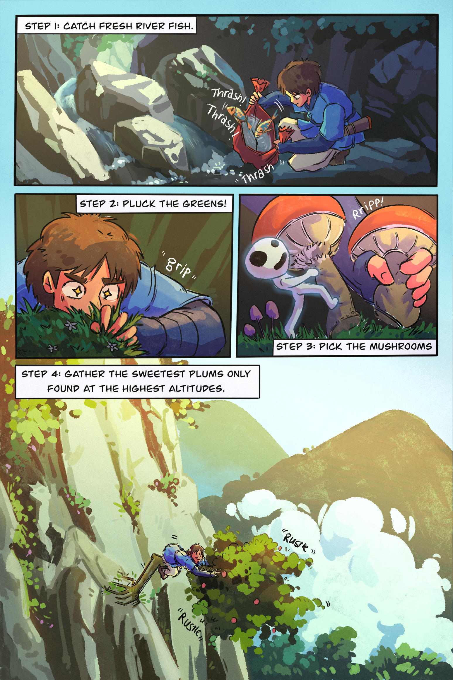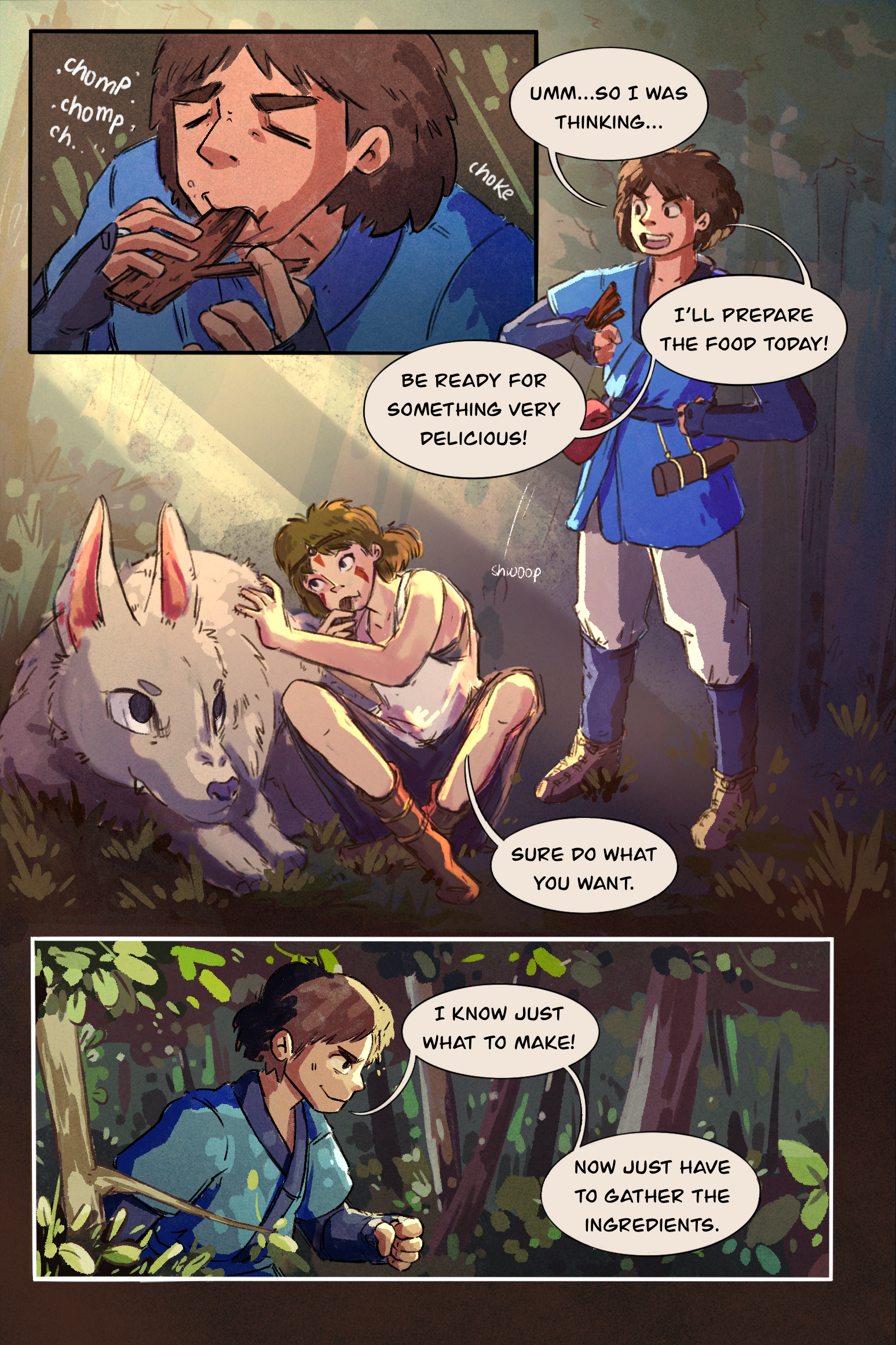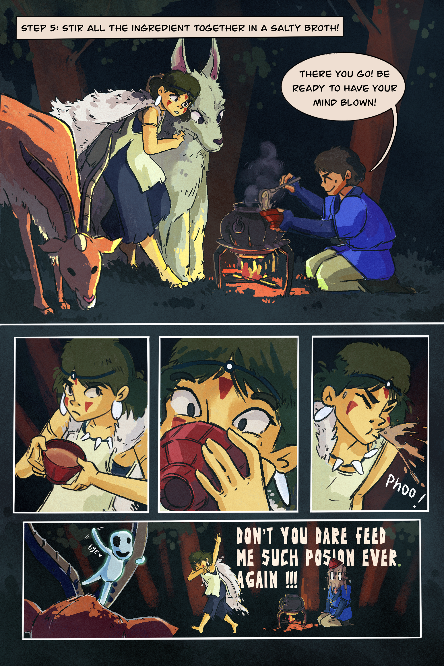 These pages are adapted from the story and characters established by Hayao Miyazaki in the movie Princess Mononoke. This narrative envisions a day when Ashitaka is tired of the raw uncooked meals he often shares with San, and enthusiastically decides to prepare a meal with spices and other ingredients in it.