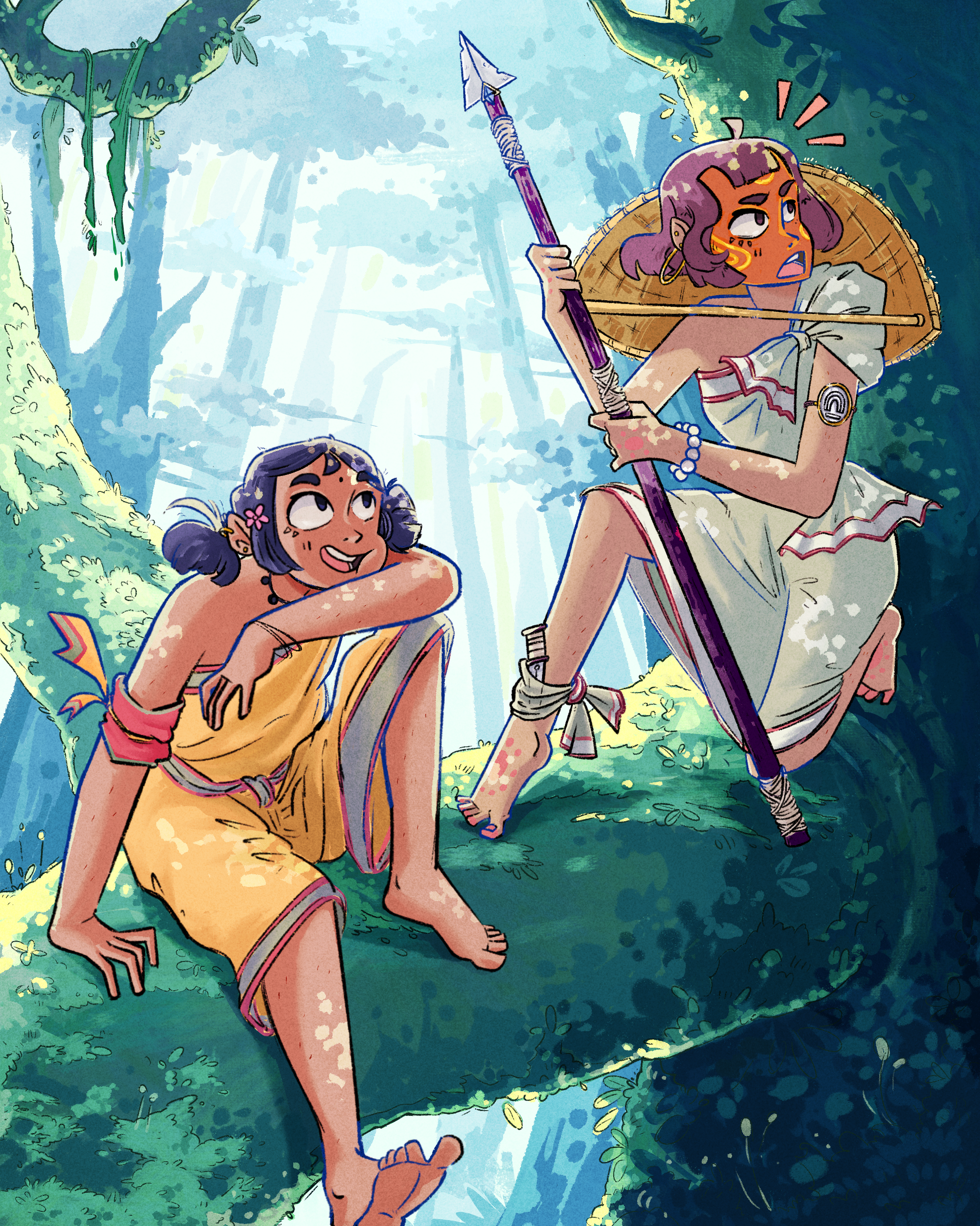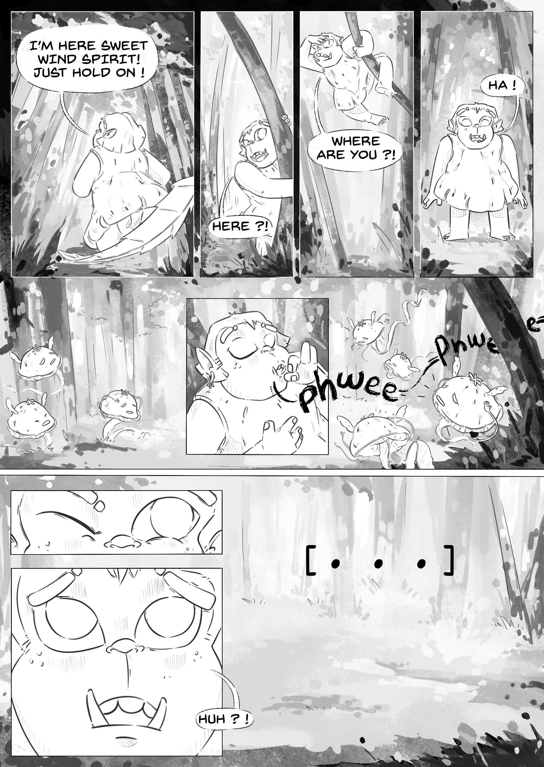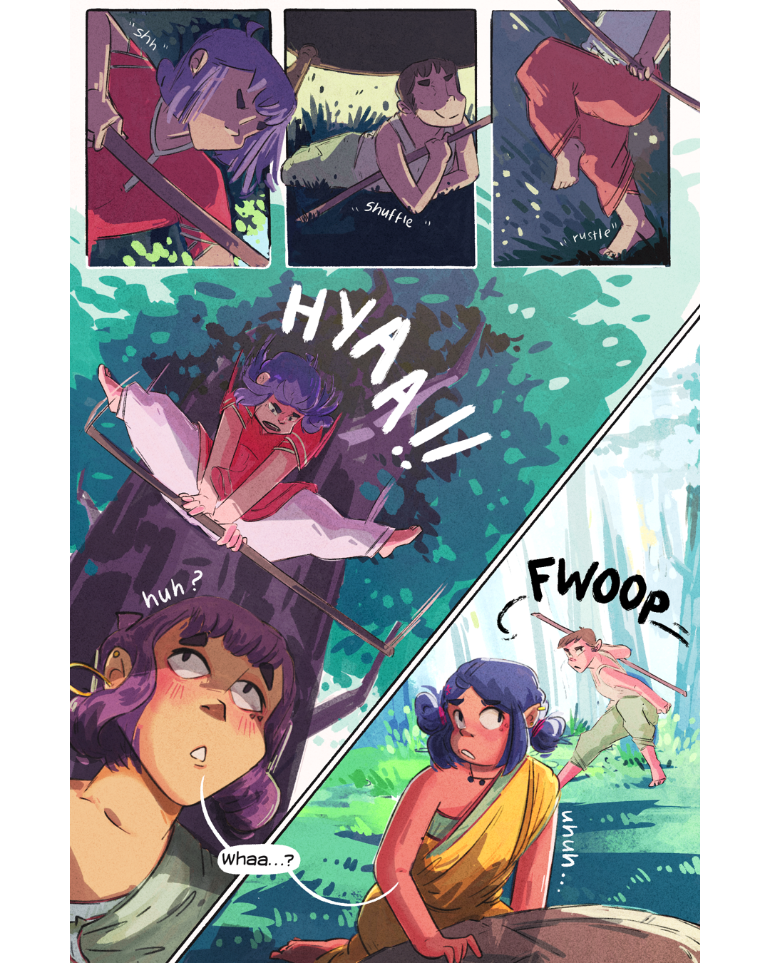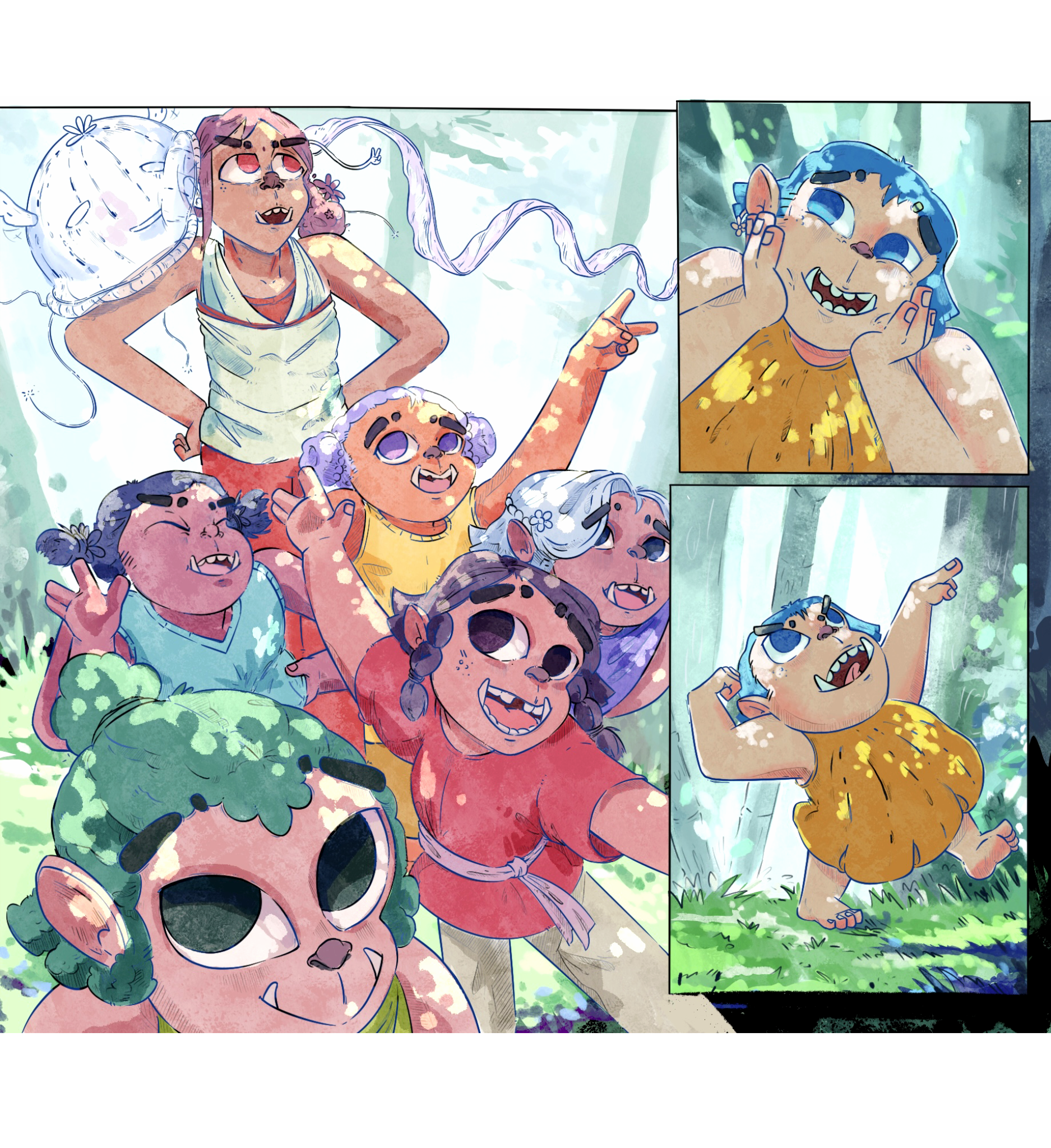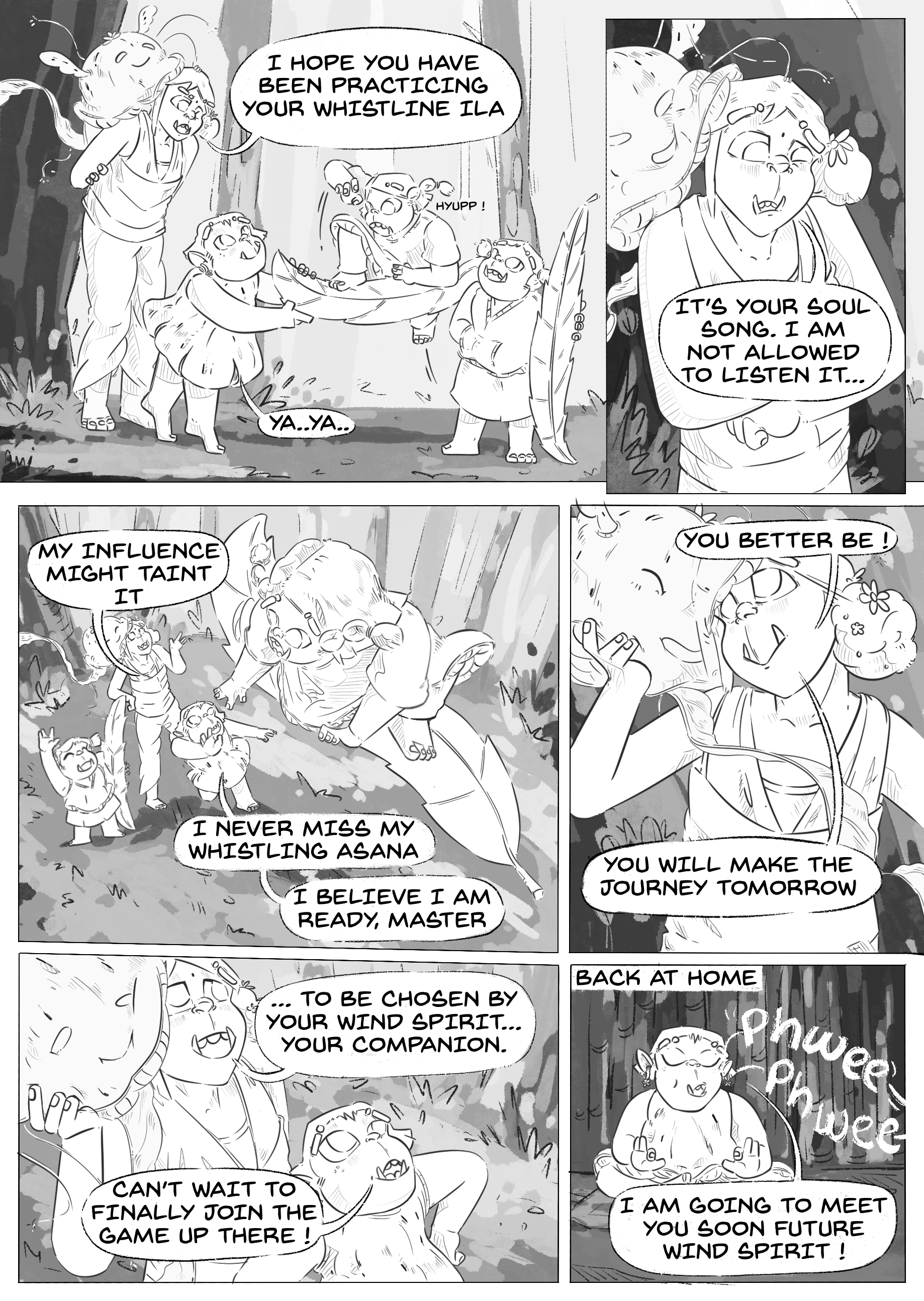 This story is about a little forest creature, Ila, who lives in a community whose members travel around by surfing the wind on leaves. There is a tradition in her village where its members befriend and bond with wild forest spirits and become lifelong companions. They form this bond by the music of whistling, which Ila is unfortunately terrible at. So, this comic follow her journey of finding her wind spirit companion in her own unique way.