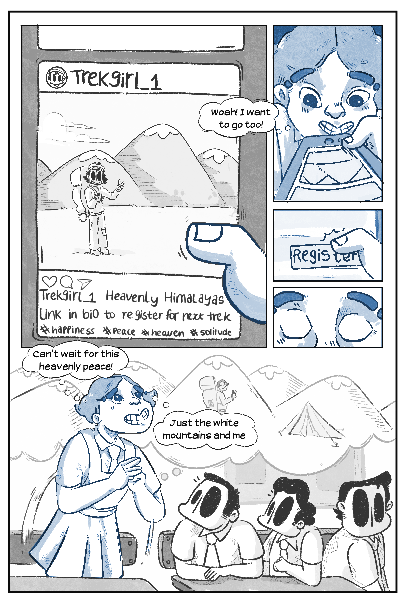 This story is about a girl with social anxiety, who always finds it hard to be a part of any social situation. She finds peace and friends on a Himalayan expedition and begins her journey of overcoming her fear of socialising one step at a time, just like trekking up a mountain.